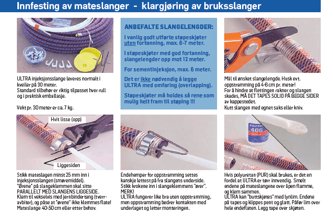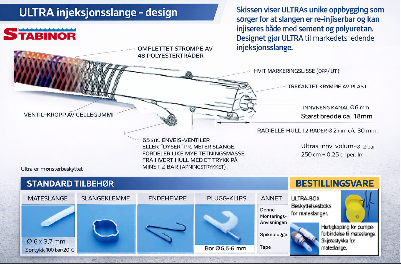 ULTRA injeksjonsslange leveres normalt i kveiler på 30 meter. Standard tilbehør er rikelig tilpasset hver rull og i praktisk emballasje.