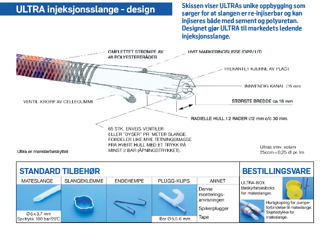 ULTRA injeksjonsslange leveres normalt i kveiler på 30 meter. Standard tilbehør er rikelig tilpasset hver rull og i praktisk emballasje.